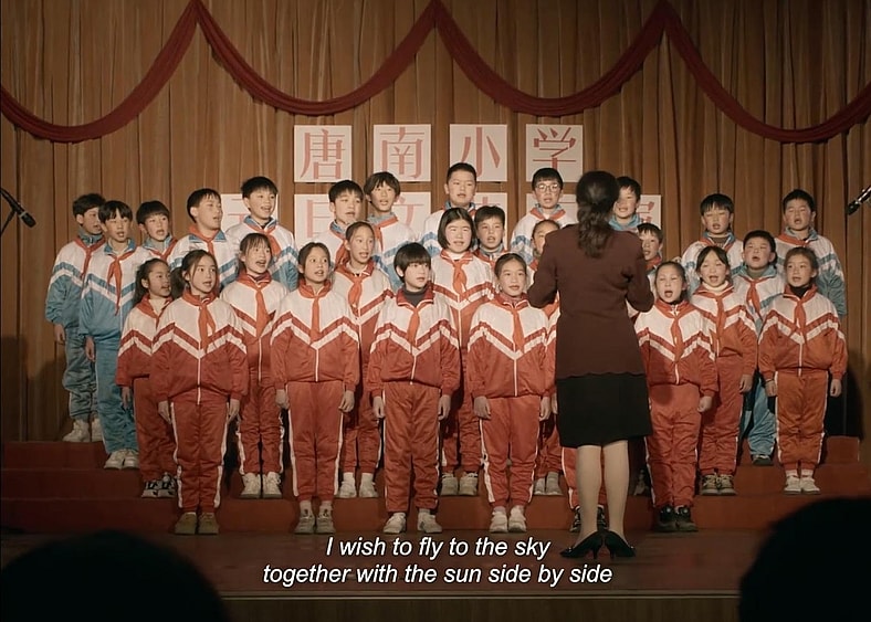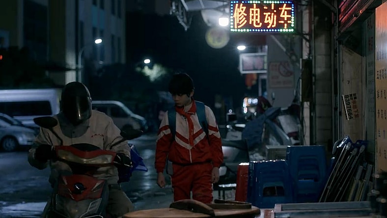 The film’s most striking visual symbol is the red and blue school uniforms—assigned markers of identity rather than chosen ones. Xiong deliberately suppresses the surrounding palette, allowing these two colors to stand out with unsettling clarity.