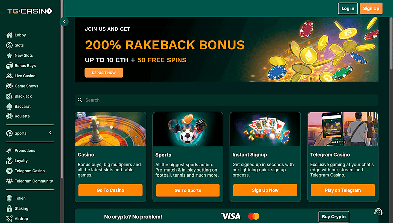 - TG.Casino – 200% bonus up to 10 ETH plus 50 free spins